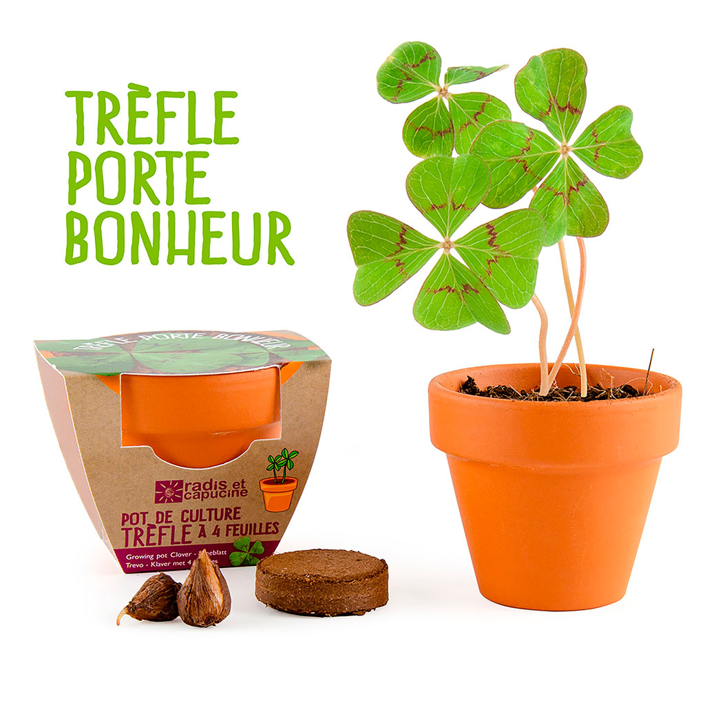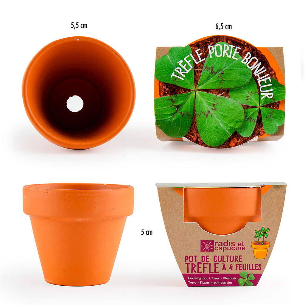 Ce mini kit de culture contient tout le nécessaire pour faire pousser un véritable trèfle à 4 feuilles dans un pot en terre cuite.