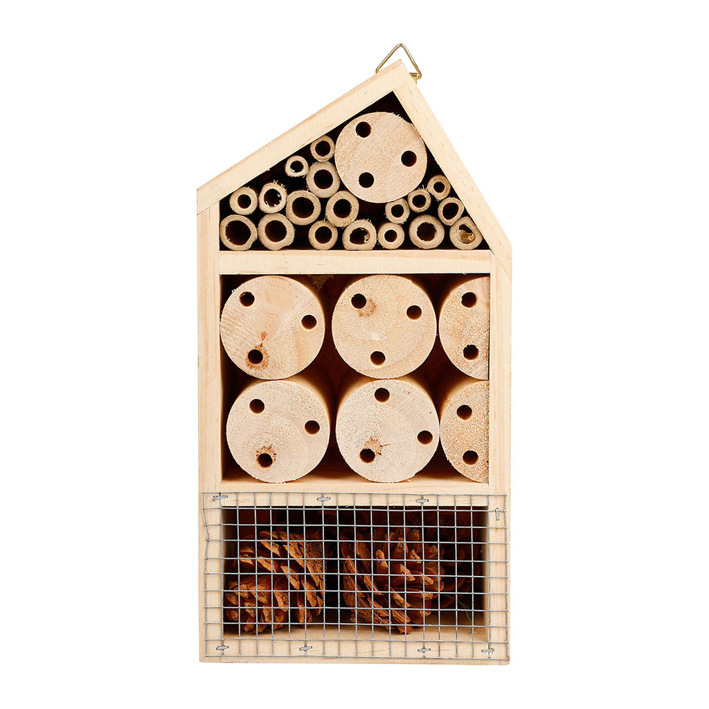 Cette maison à insectes en pin arbore une structure naturelle en bois clair dont les veines apparentes soulignent l'aspect authentique et écologique.