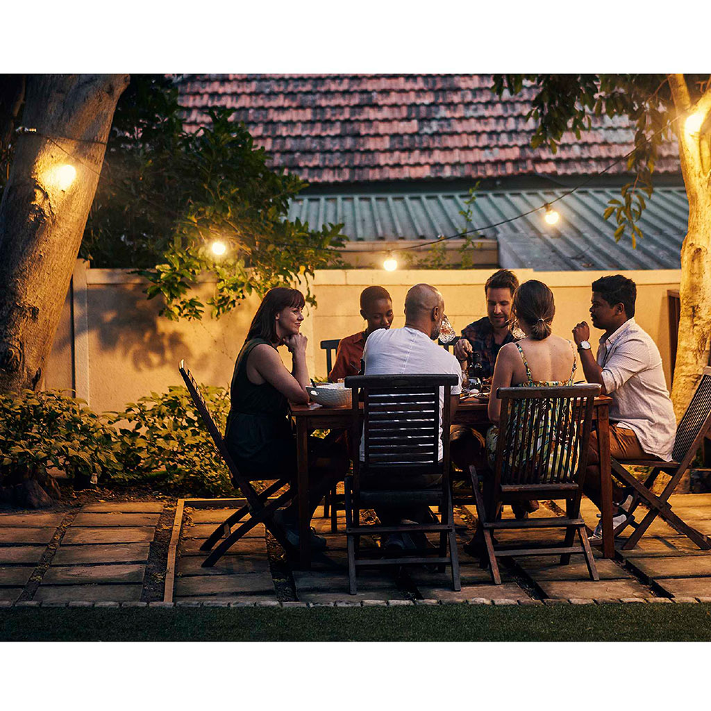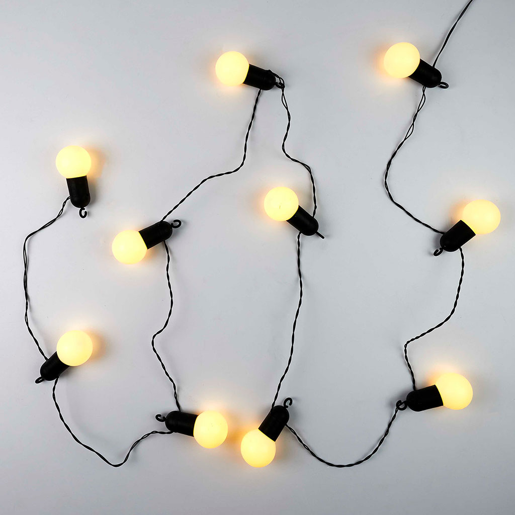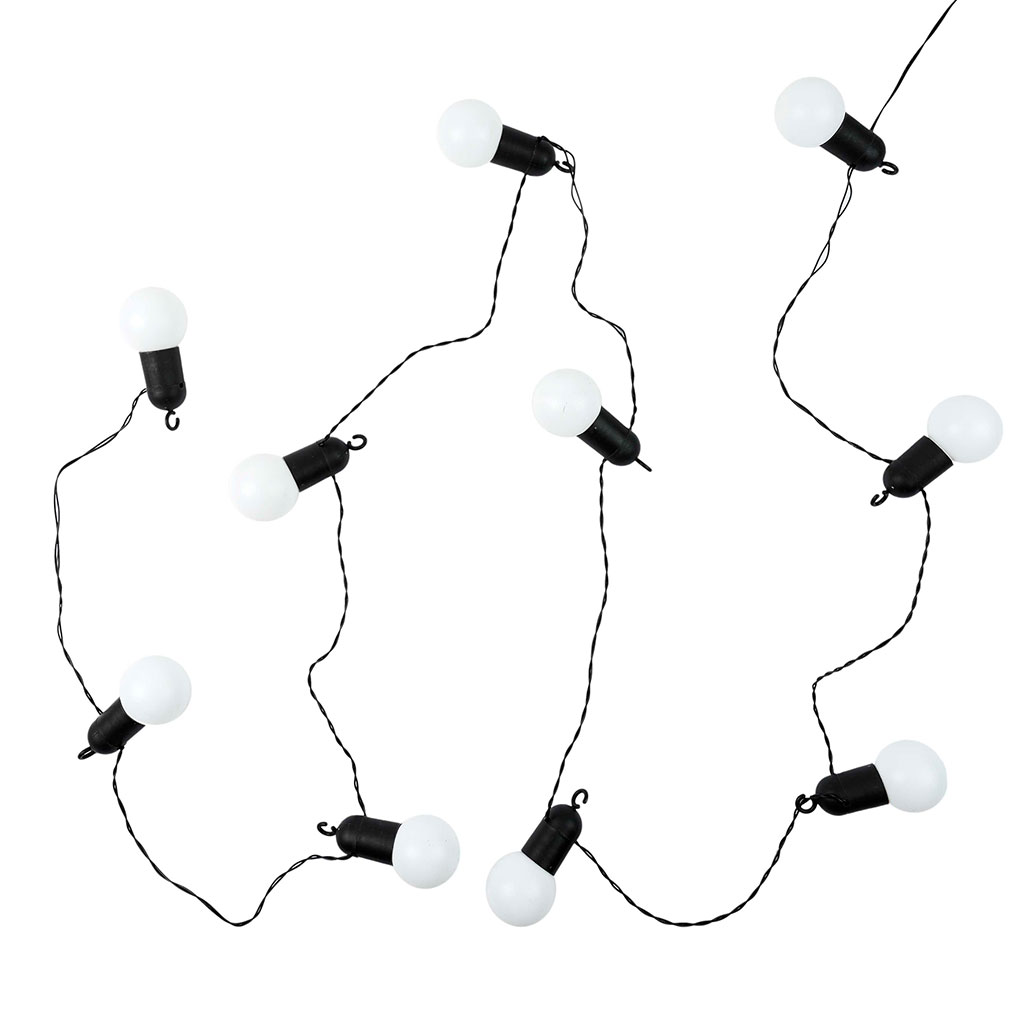 Cette guirlande lumineuse polyvalente, conçue pour un usage intérieur comme extérieur, dispose de 10 globes blancs montés sur un câble noir robuste.