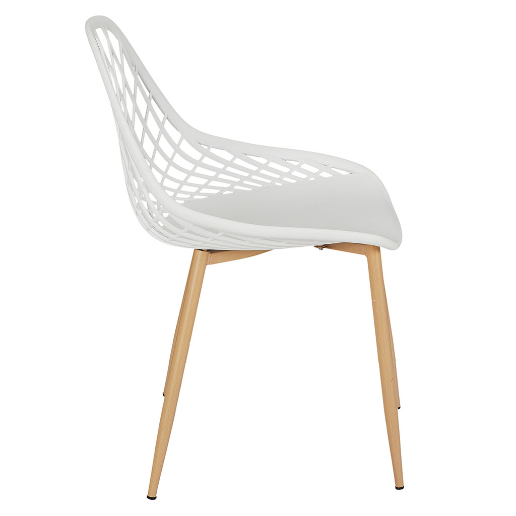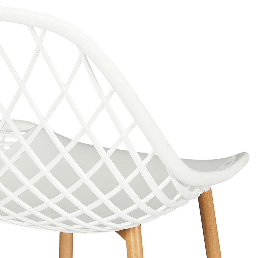 Sa structure en plastique blanc contraste joliment avec ses pieds imitation bois, en métal robuste, pour une assise à la fois stable et facile à déplacer.