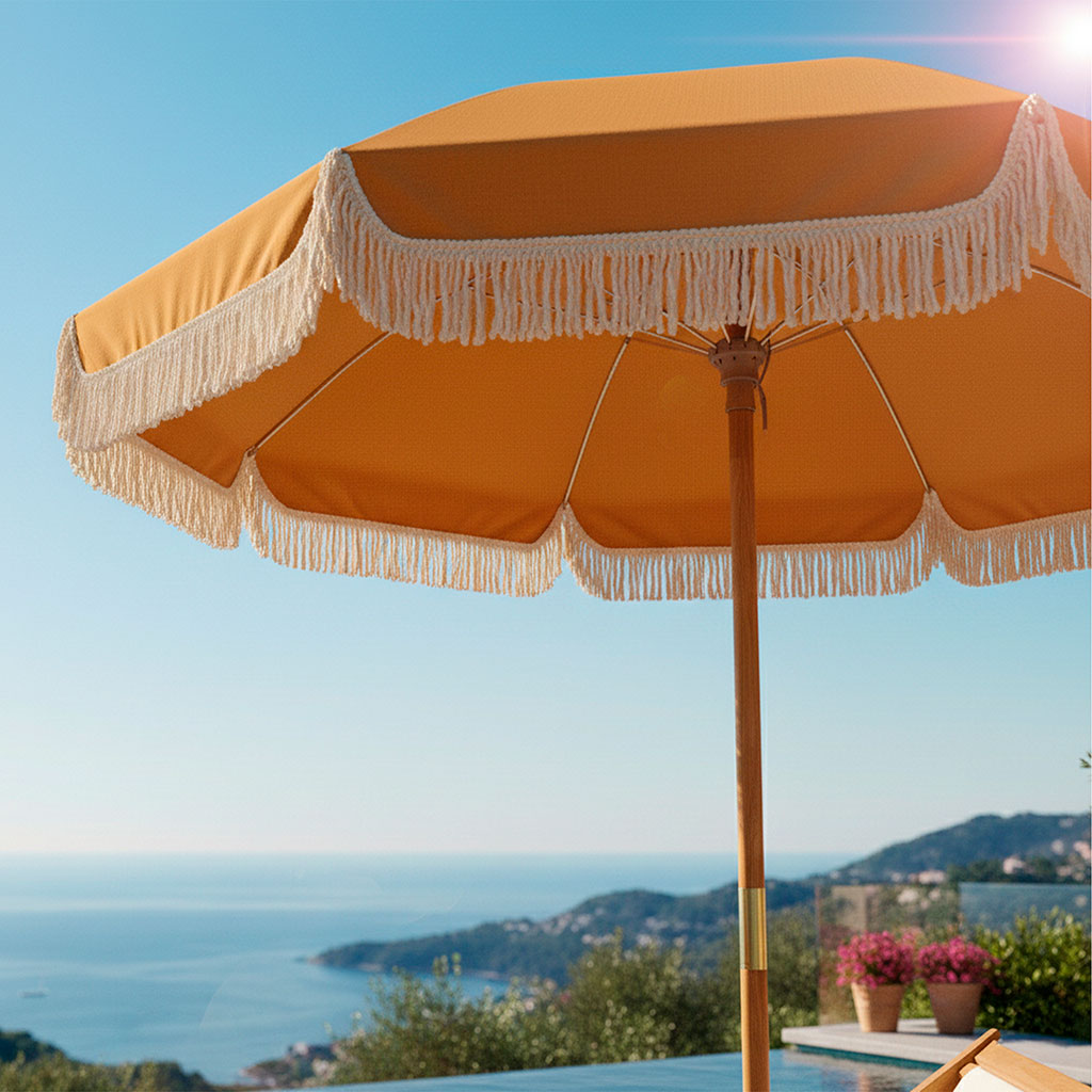Ajoutez une touche bohème à votre espace extérieur avec ce parasol à frange en tissu moutarde.