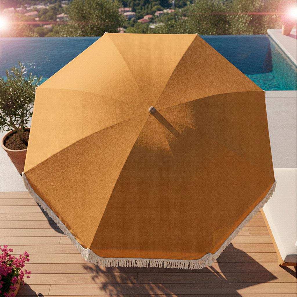 05 56 69 68 67-contact@fabriquedestyles.frParasol à frange en tissu moutarde d200xh220cm - Gaya