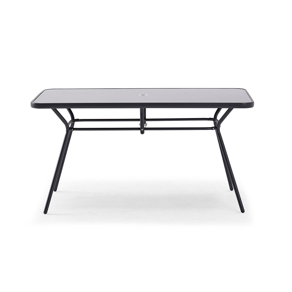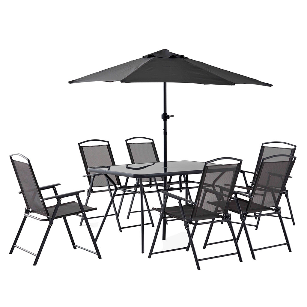 05 56 69 68 67-contact@fabriquedestyles.frEnsemble table de jardin, 6 chaises et parasol central noir en acier 140x80cm - Braga