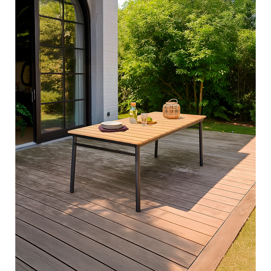L'association de l'aluminium anthracite et de l'effet chêne confère à cette table un charme contemporain tout en étant résistant aux intempéries.