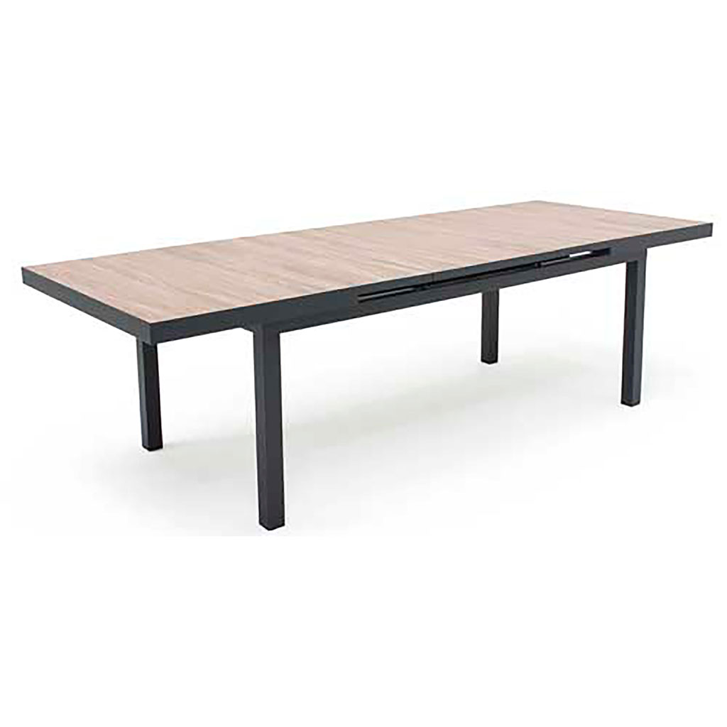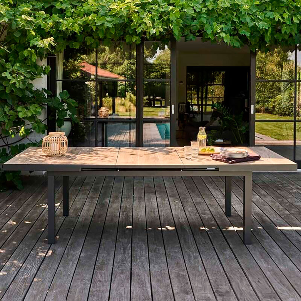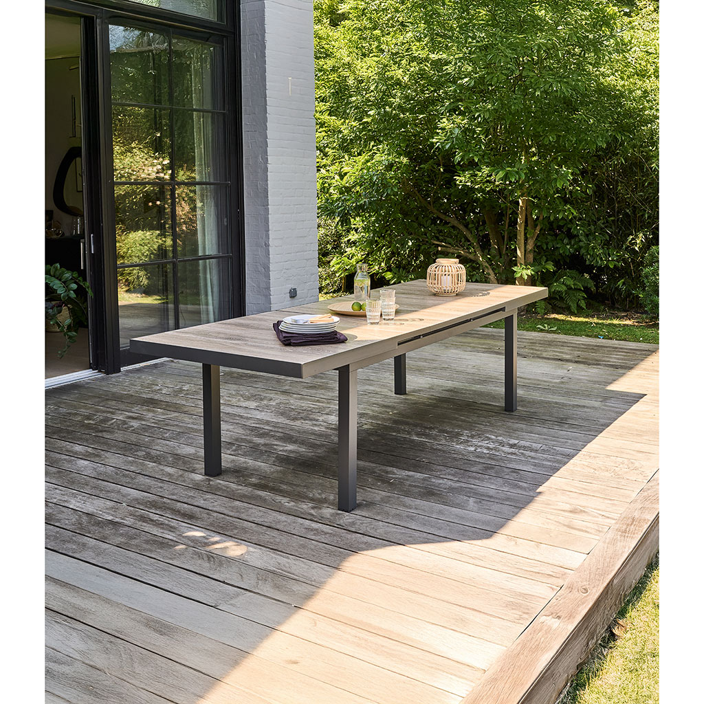 05 56 69 68 67-contact@fabriquedestyles.frTable de jardin extensible en aluminium et céramique effet bois 200/260x100cm - Turin