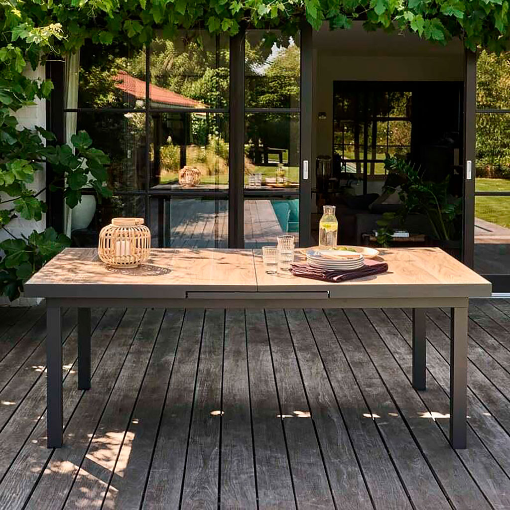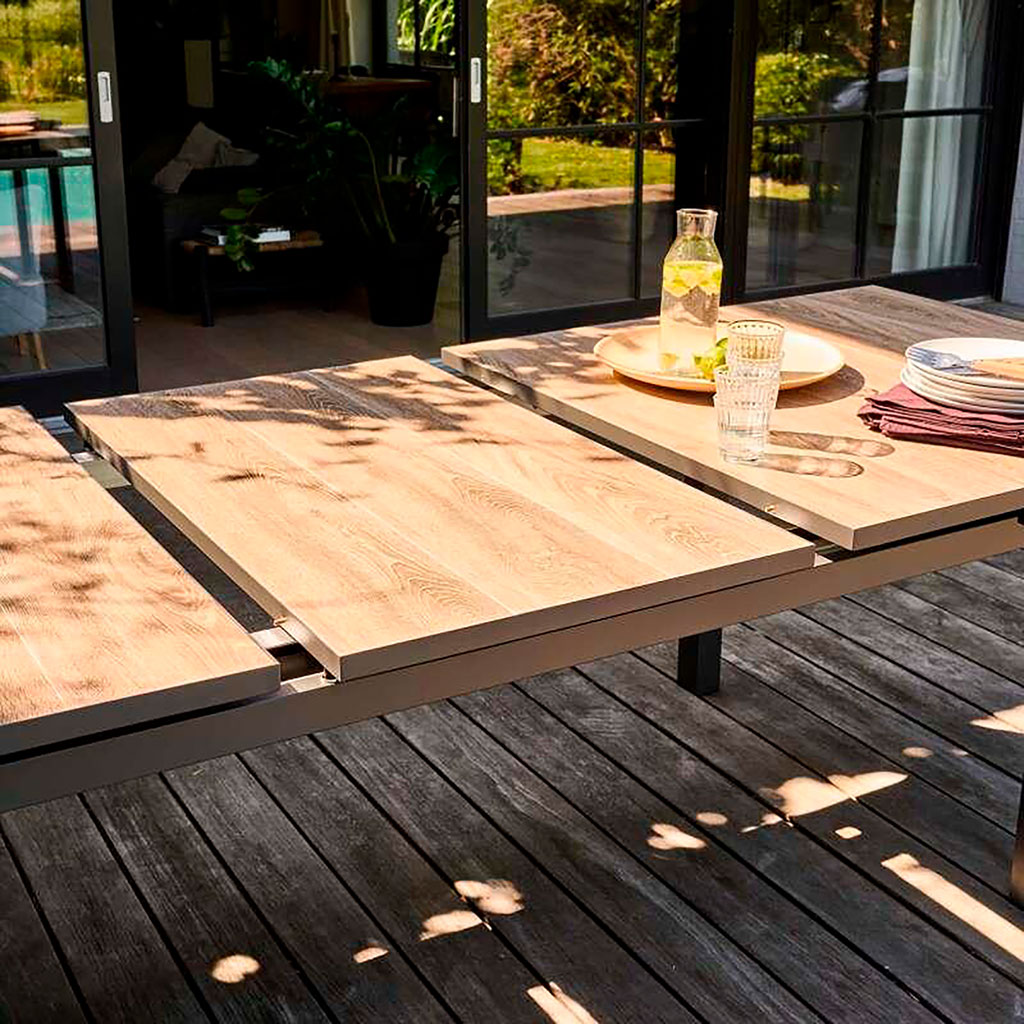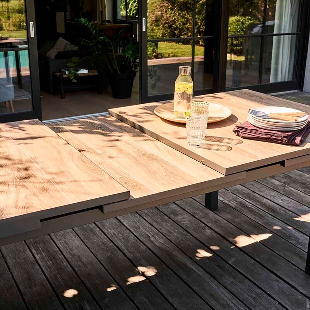 05 56 69 68 67-contact@fabriquedestyles.frTable de jardin extensible en aluminium et céramique effet bois 200/260x100cm - Turin