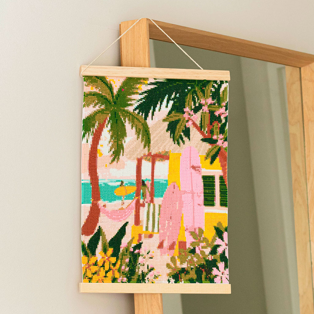 Cette affiche à diamanter met en scène une plage animée où les textures des diamants facettés apportent un éclat particulier aux planches de surf et à la mer scintillante.