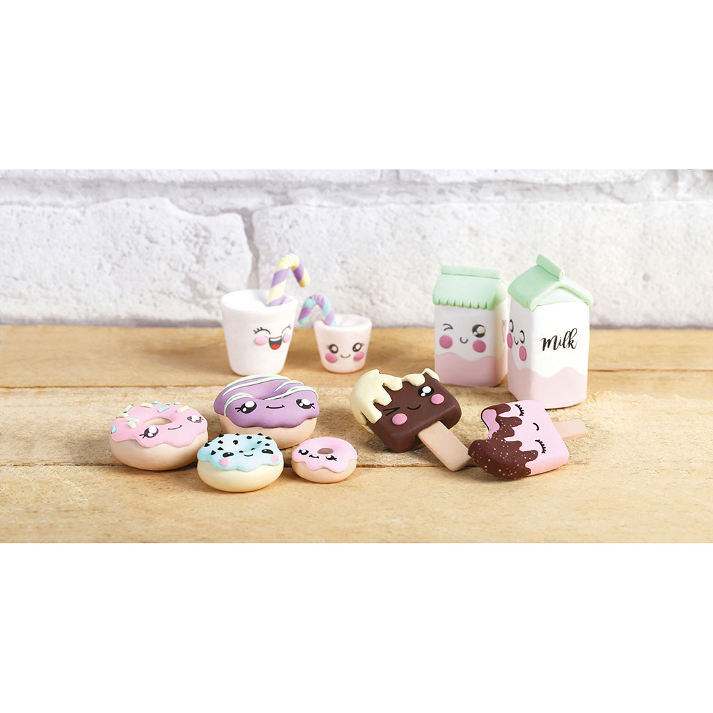 Dans une mallette de rangement, retrouvez tout le nécessaire pour réaliser des donuts, des glaces, des briques et des verres de lait avec des yeux trop mignons !