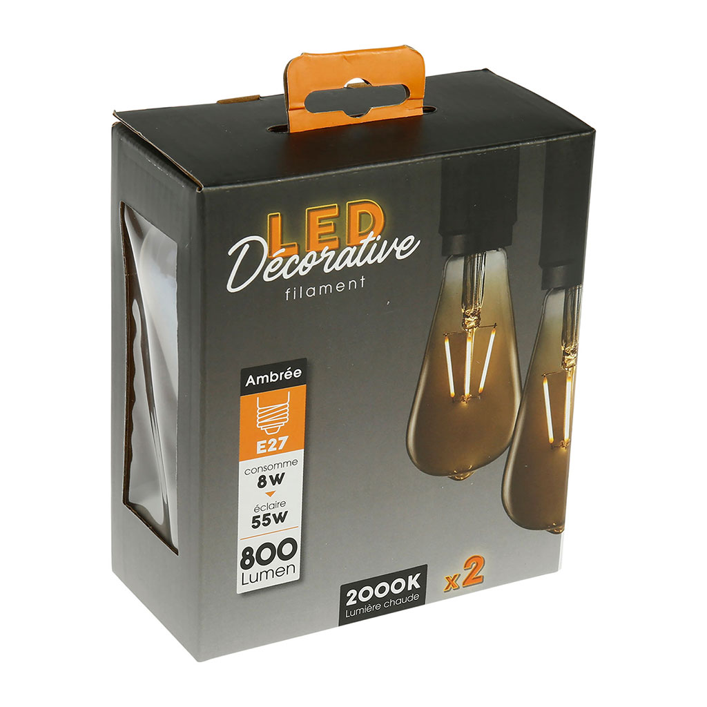 Ce lot de deux ampoules LED poire à filament ambré transforme instantanément l'ambiance lumineuse de votre pièce grâce à son design rétro et sa lueur dorée.