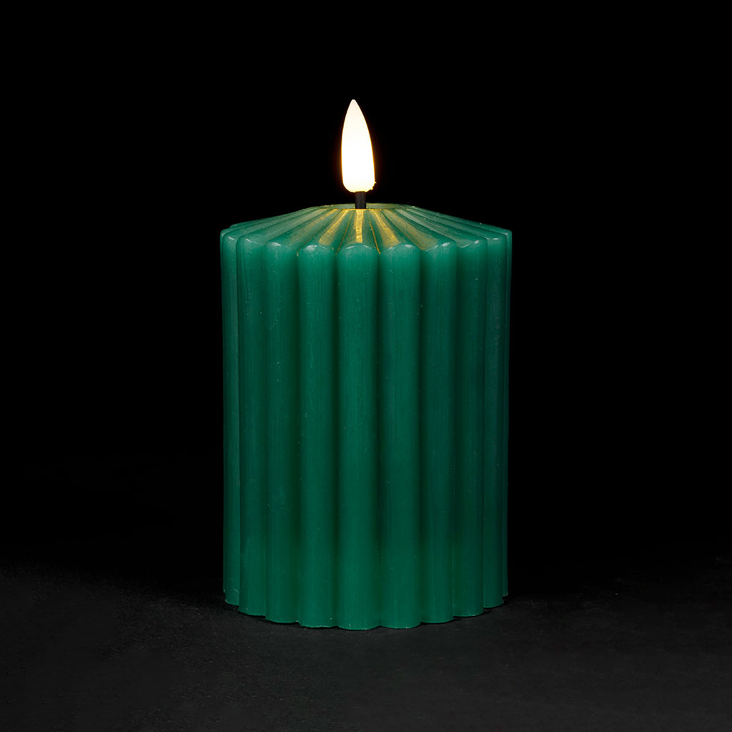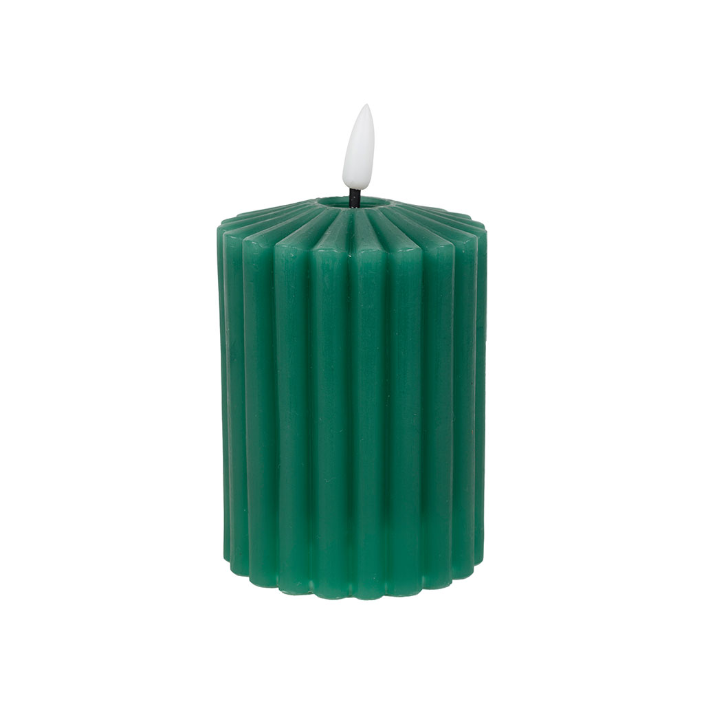 Découvrez l'effet apaisant d'une lueur douce et chaleureuse avec notre bougie LED en forme de pilier, habillée d'un vert apaisant et mesurant 14 cm de hauteur.