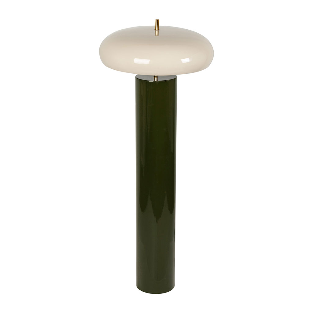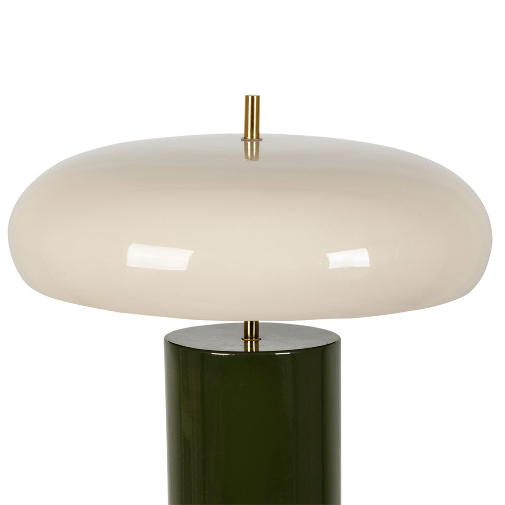 Sa structure verticale se compose d'un pied cylindrique robuste en métal coloris vert kaki, surmonté d'un abat-jour arrondi de teinte crème.