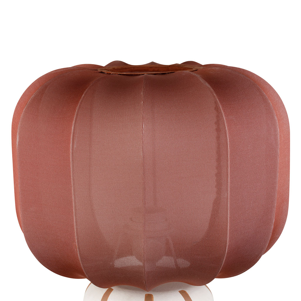 Cette lampe à poser en céramique et coton terracotta et écru apporte une présence naturelle et texturée à votre décoration intérieure.