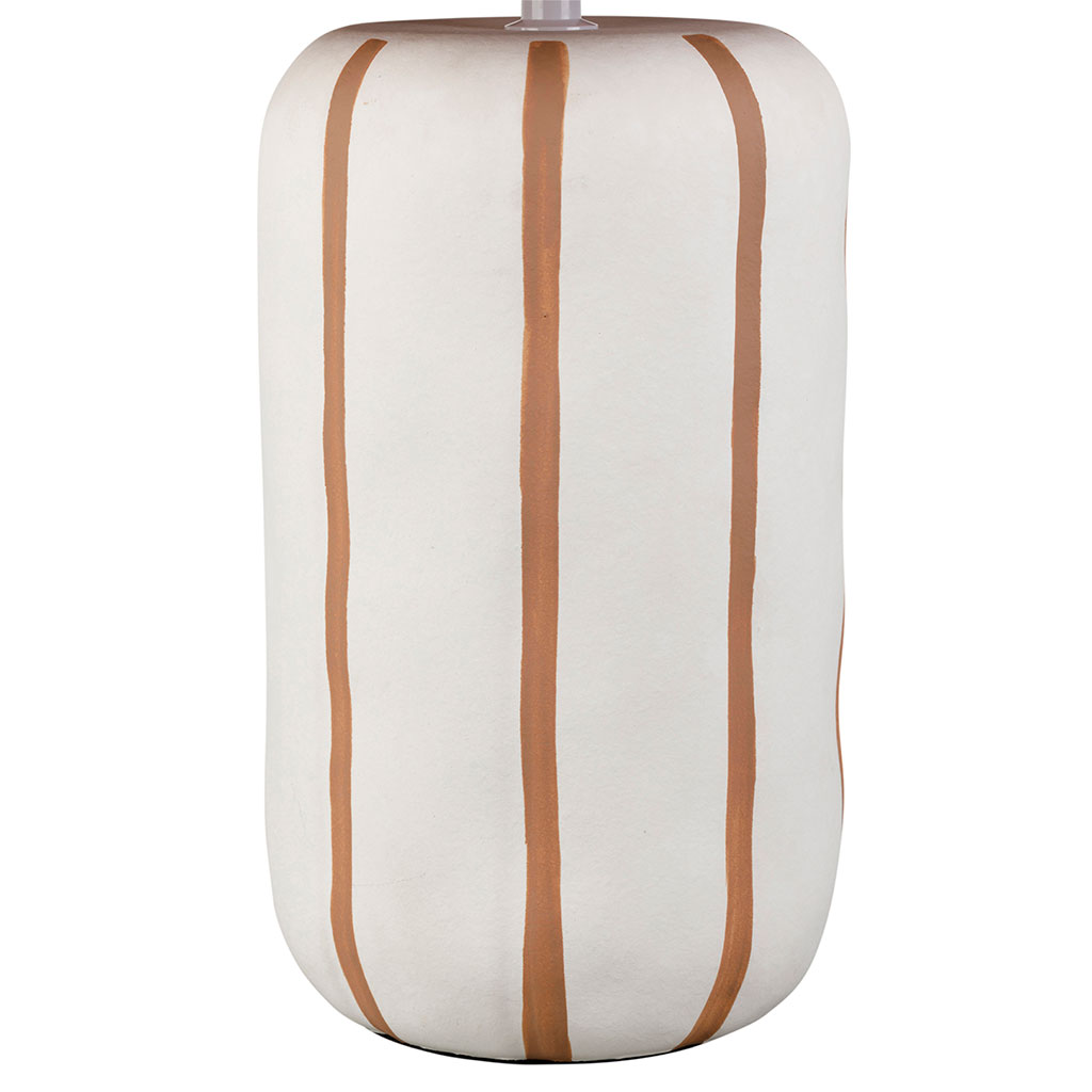 Le pied en céramique arbore des rayures horizontales aux tons terreux, créant un contraste doux avec l'abat-jour cylindrique en textile clair.