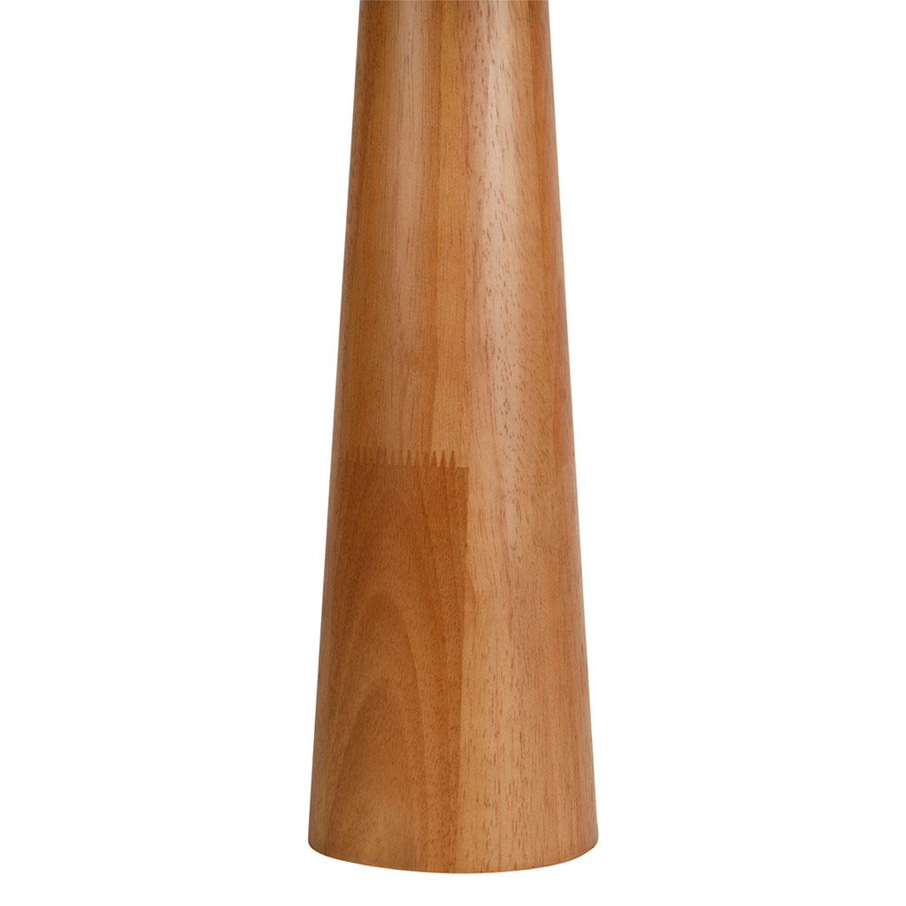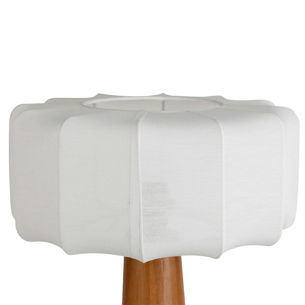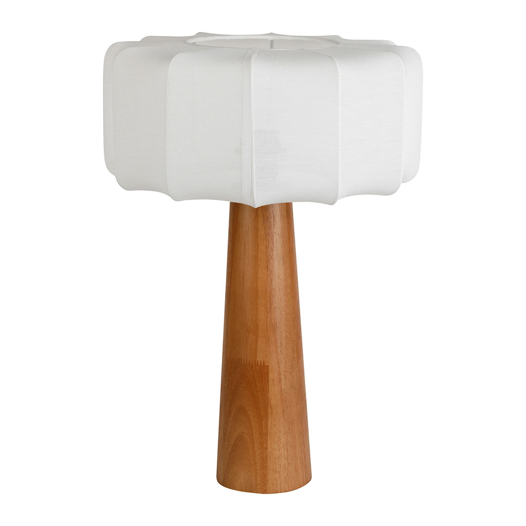 Cette lampe à poser associe un pied en hévéa naturel à un abat-jour en coton blanc pour créer un luminaire au design doux et équilibré.