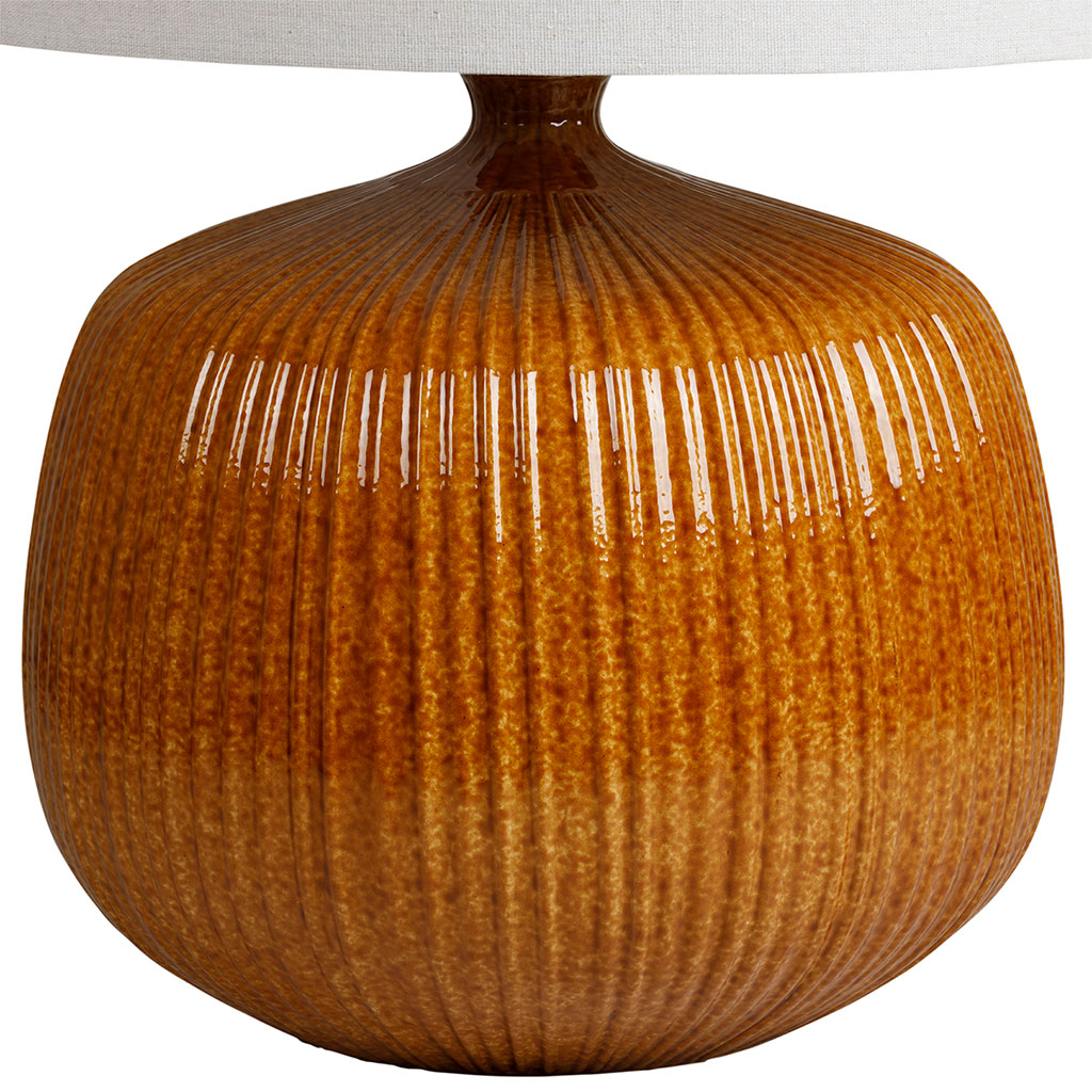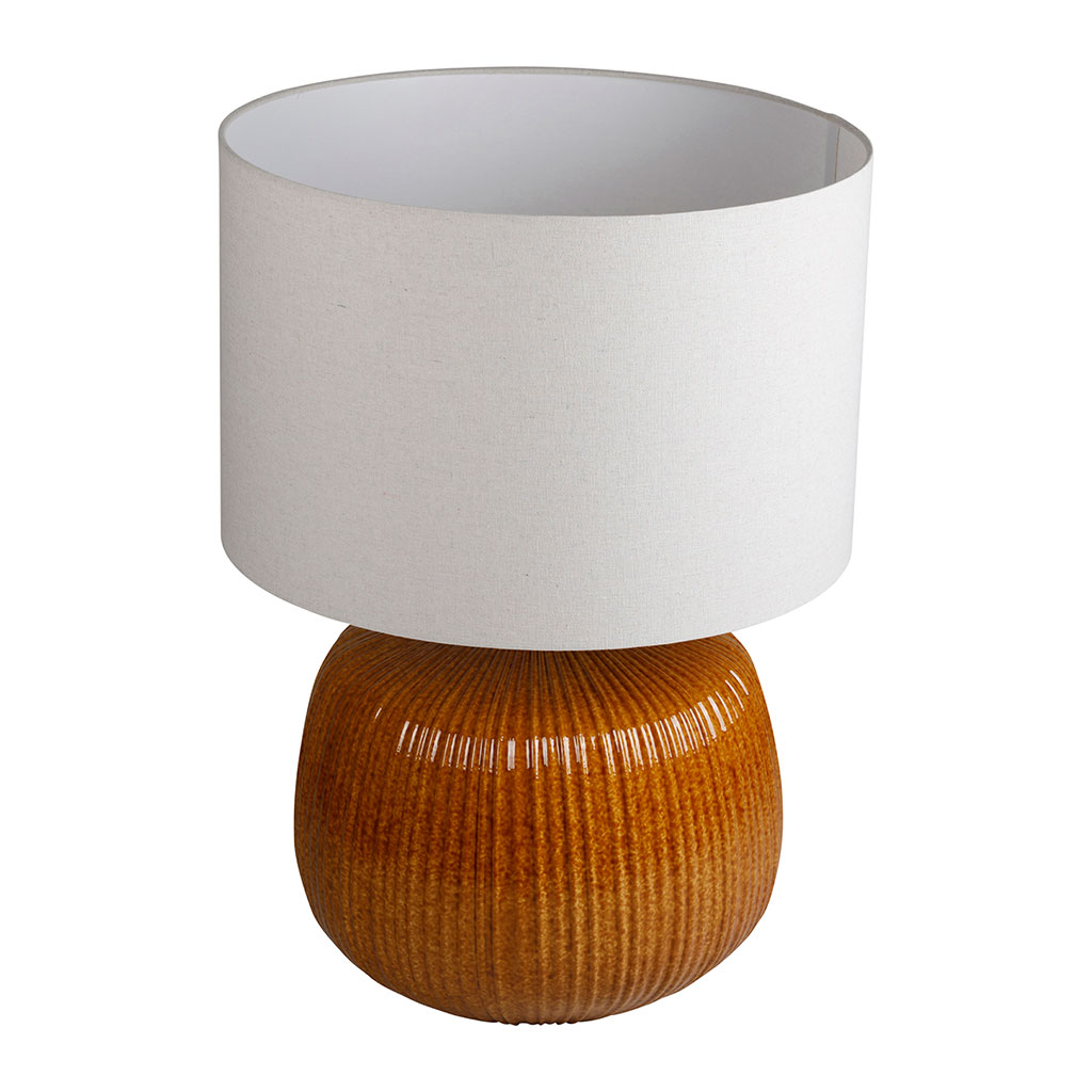 La lampe en lin et céramique ambre Klaros se distingue par sa base sculpturale aux nuances terreuses et organiques.