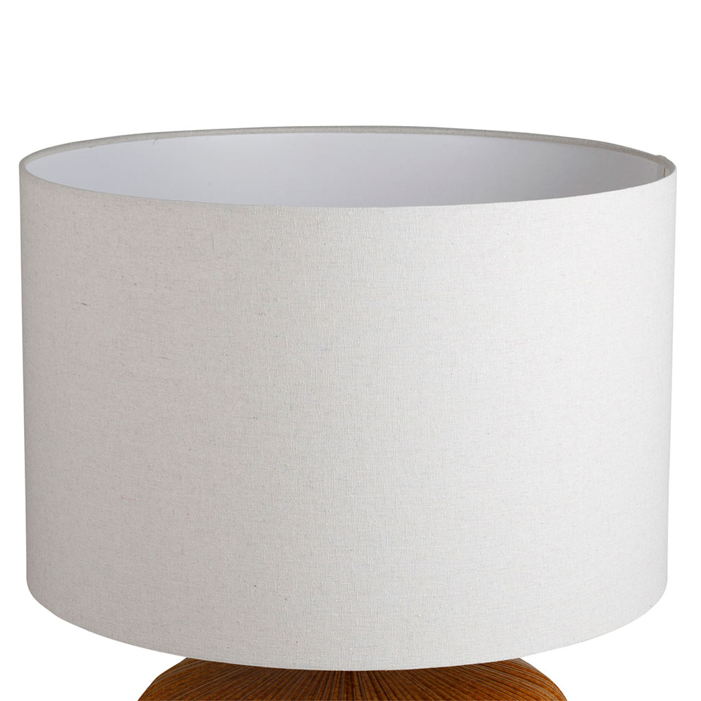 Elle est couronnée par un abat-jour cylindrique en lin naturel dont la trame apparente filtre la lumière pour diffuser une clarté douce, idéale pour créer une atmosphère apaisante une fois la nuit tombée.