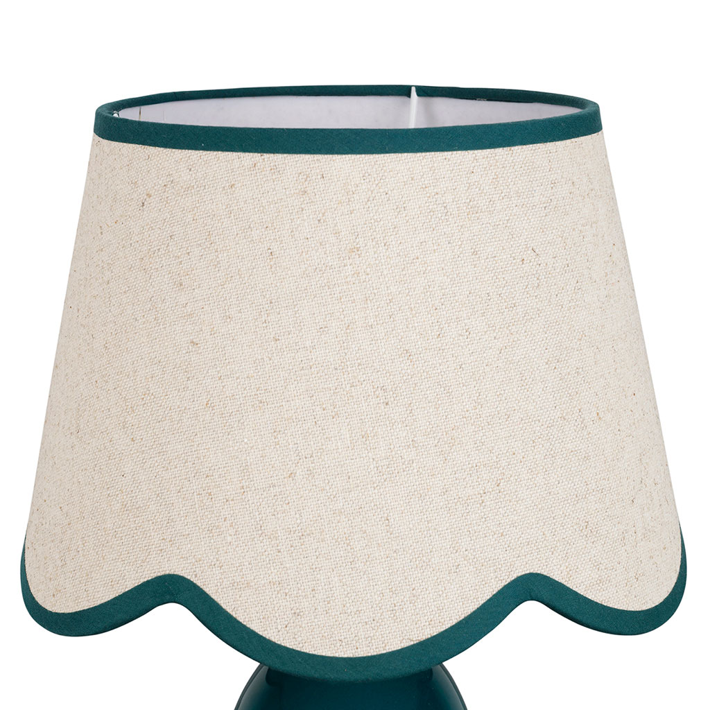 Son abat-jour en lin arbore une bordure inférieure ondulée, soulignée par un liseré contrastant qui apporte une touche de douceur et de fantaisie.