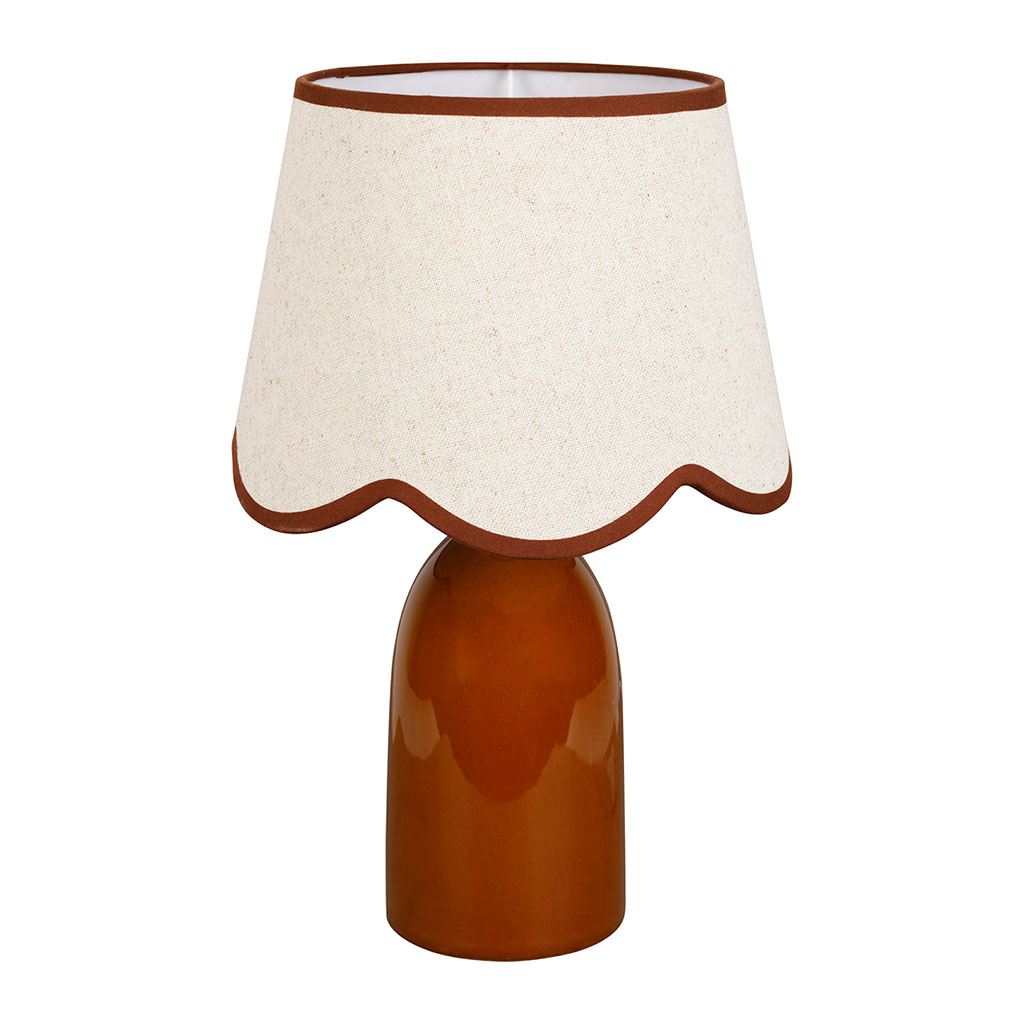 L'abat-jour en lin clair, rehaussé d'un feston brun sur sa base ondulée, crée un rappel élégant avec le socle, offrant un équilibre visuel apaisant.