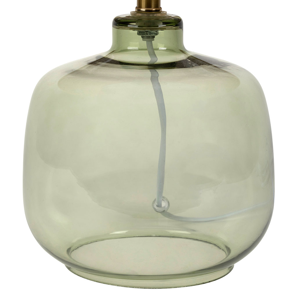 Le pied en verre transparent offre une élégance discrète tout en mettant en valeur la finesse du lin vert qui compose son abat-jour.