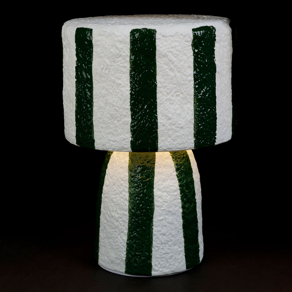 05 56 69 68 67-contact@fabriquedestyles.frLampe en porcelaine rayée émeraude et blanc h27cm G9 - Alaria