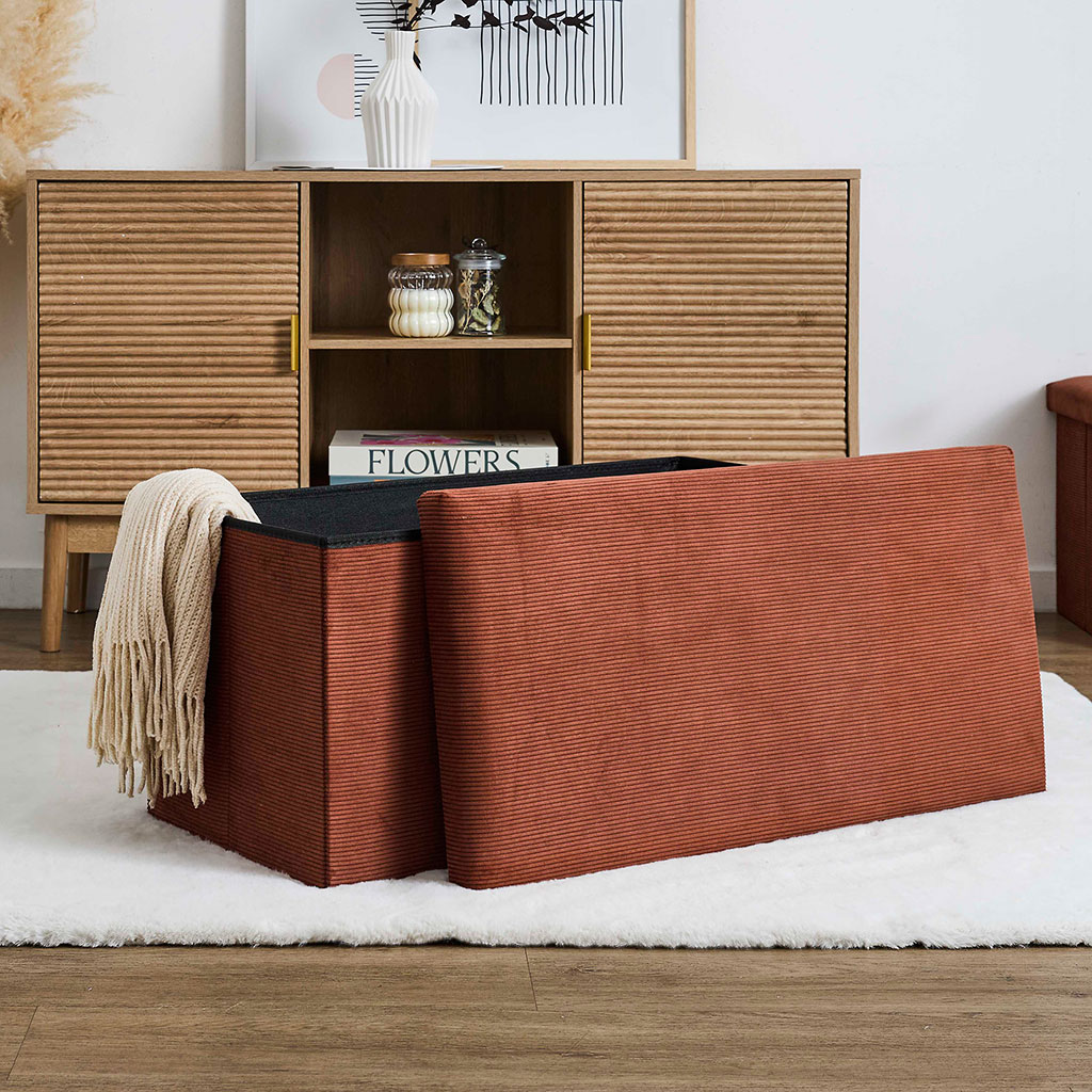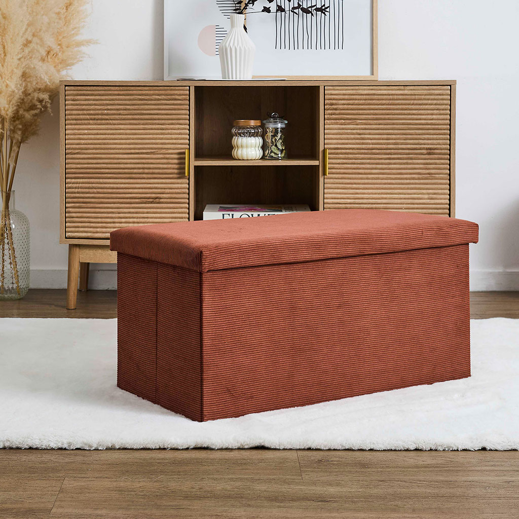Transformez votre espace de vie avec ce banc coffre pliable en tissu côtelé terracotta.