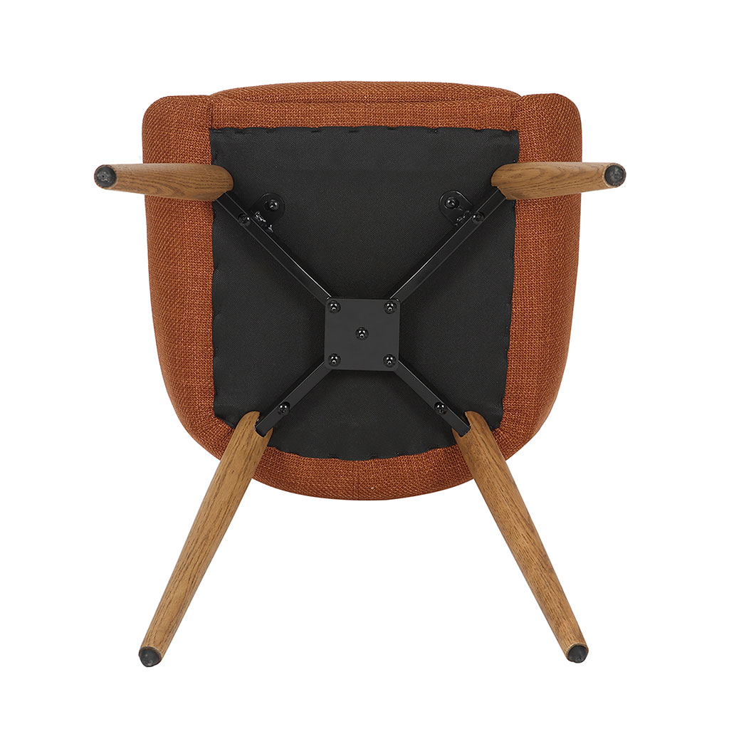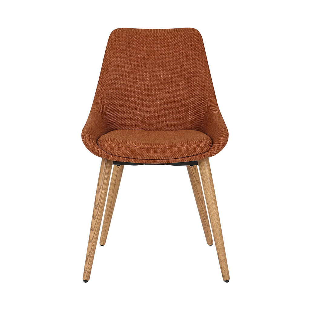 Avec son revêtement en tissu cognac et ses pieds en chêne foncé, cette chaise apporte une touche de chaleur et de caractère à votre espace repas.
