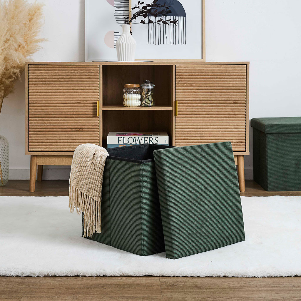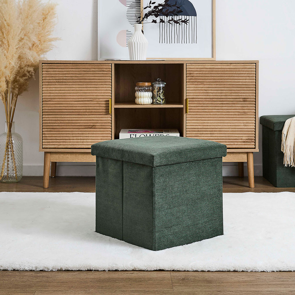 Découvrez le pouf coffre pliable en tissu côtelé vert, un ajout astucieux et polyvalent à votre foyer.