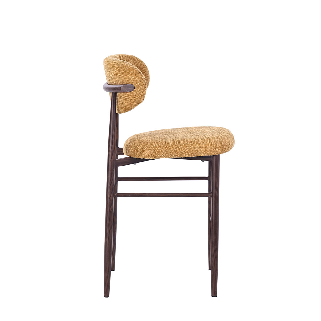 Son tissu jauni lumineux contraste harmonieusement avec ses pieds en métal à l'effet noyer foncé, apportant une allure à la fois contemporaine et chaleureuse.