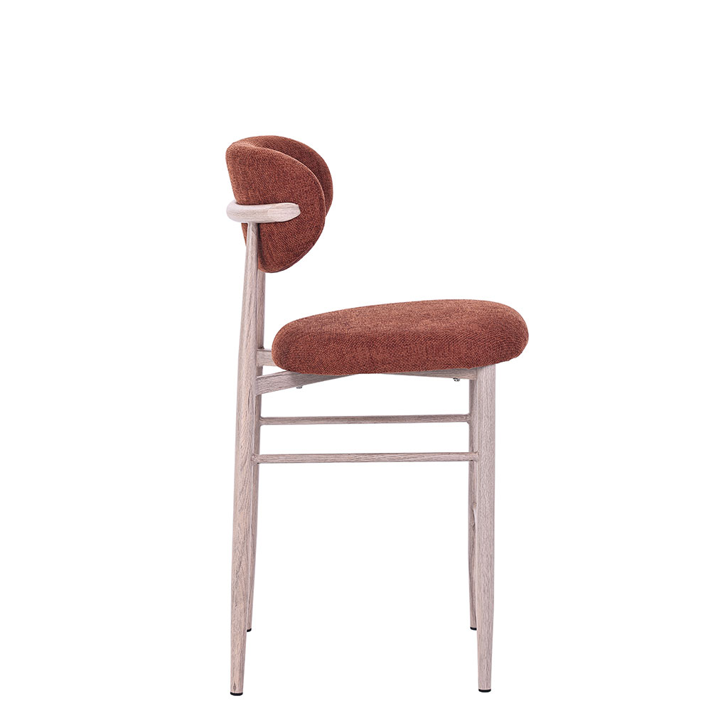 Le siège, en tissu chaleureux couleur terracotta, capte la lumière pour un rendu à la fois doux et éclatant, tandis que les pieds en métal imitent parfaitement l'aspect du chêne clair.