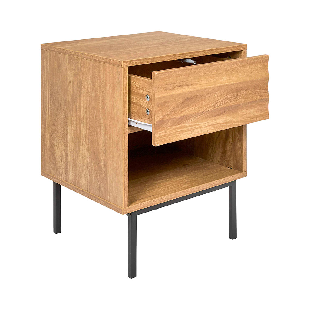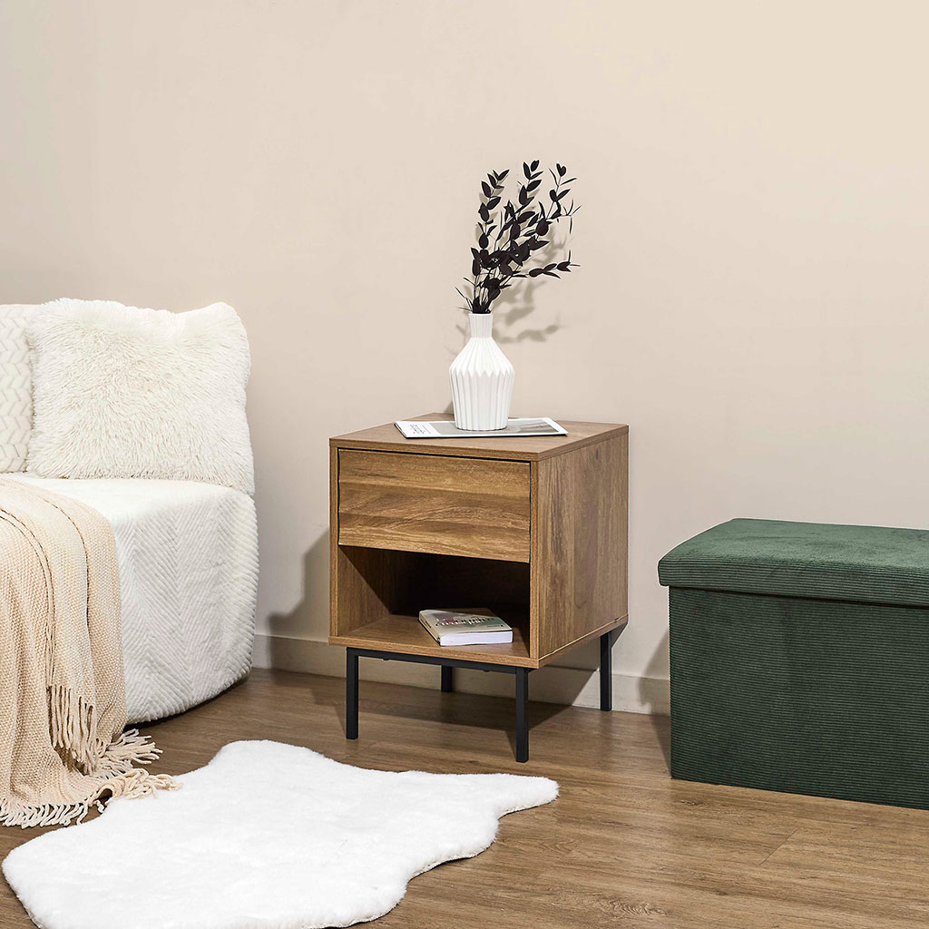 Sa niche ouverte permet de garder vos objets préférés à portée de main tandis que le tiroir dissimule vos effets personnels plus confidentiels.
