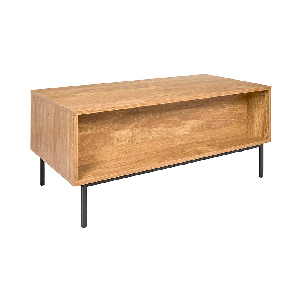 Cette table basse en bois clair se caractérise par son design fonctionnel aux finitions naturelles et contrastées.