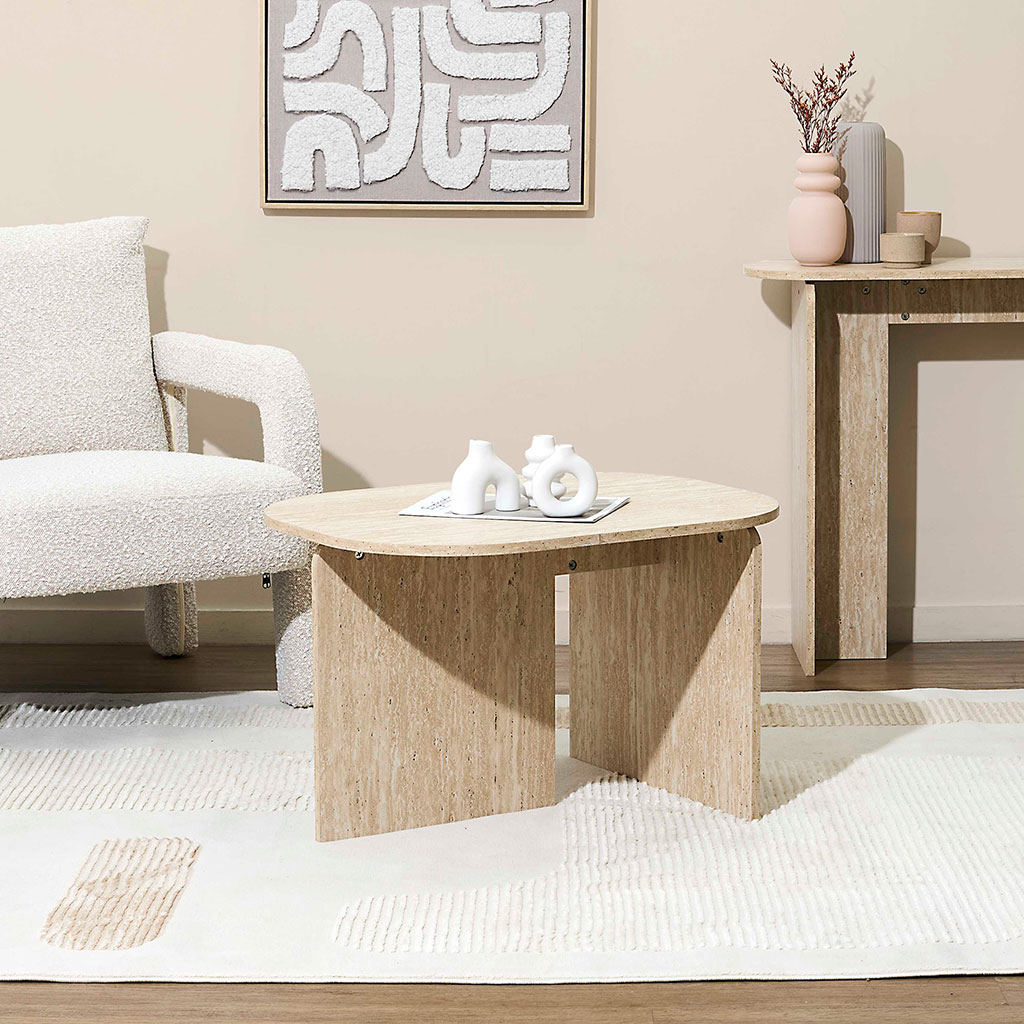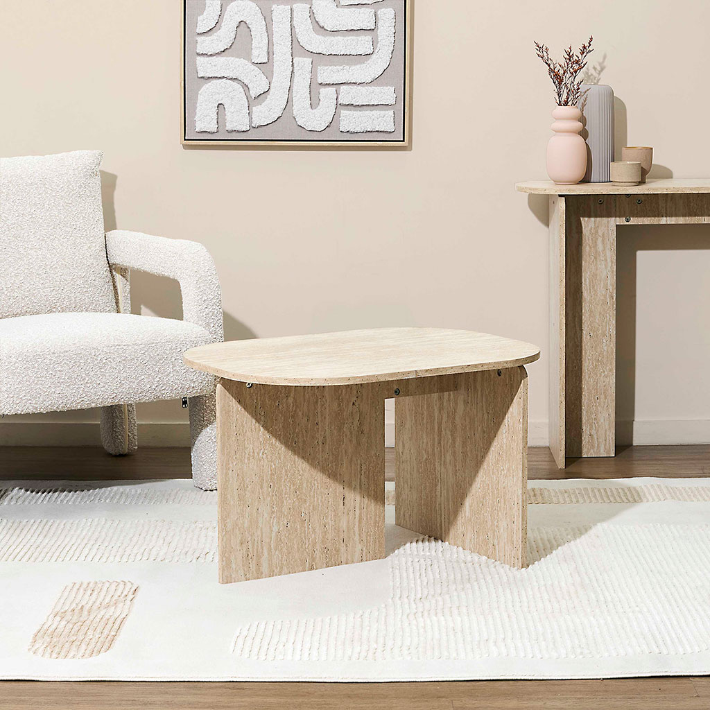 Inspirée des textures naturelles, cette table affiche une finition effet pierre travertin très tendance, qui s’intègre aussi bien dans un intérieur moderne que bohème ou wabi-sabi.