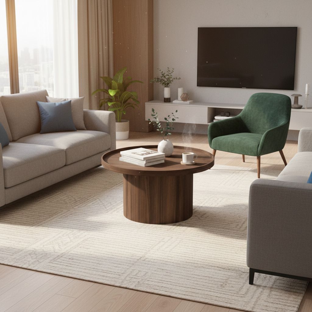 Son diamètre de 80 cm offre suffisamment d’espace pour accueillir magazines, tasses de café ou objets déco, tout en sublimant les nuances chaleureuses du châtaignier.