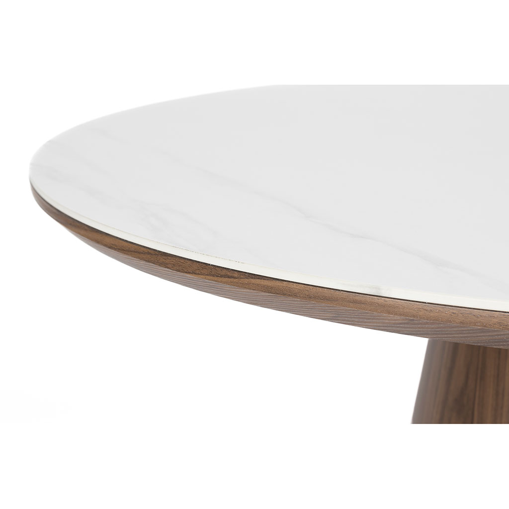 Avec son plateau ovale et son piètement plein en bois de noyer, la table à manger Almira attire tous les regards.