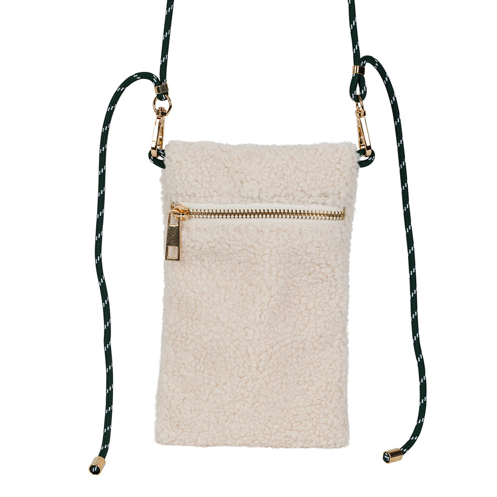 05 56 69 68 67-contact@fabriquedestyles.frPochette en tissu bouclette écru avec lanière émeraude - Funky