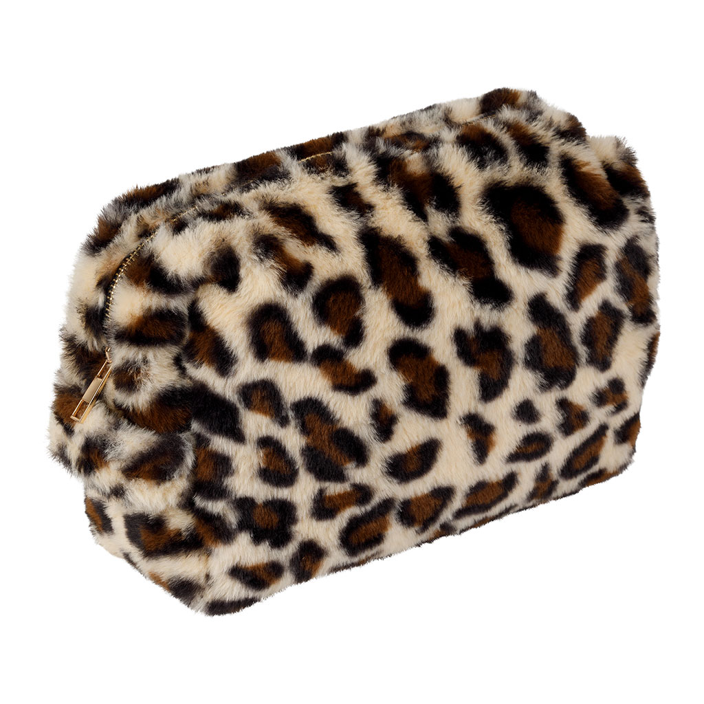 Découvrez l'incarnation du style sauvage avec notre trousse de toilette en fausse fourrure léopard écru et brun.