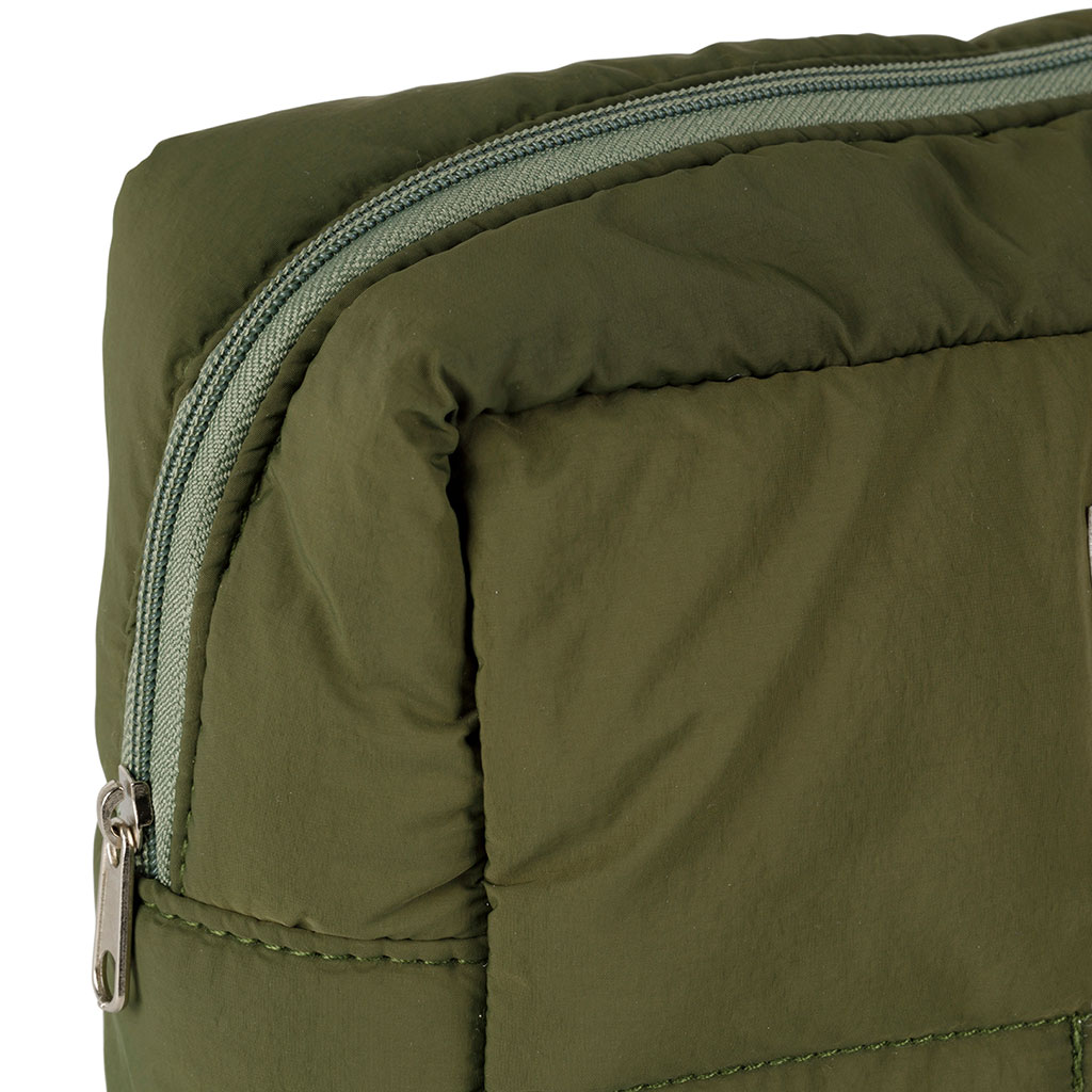 Conçue en tissu matelassé vert, cette trousse associe fonctionnalité et esthétisme pour vous simplifier la vie tout en ajoutant une touche de couleur à votre routine.