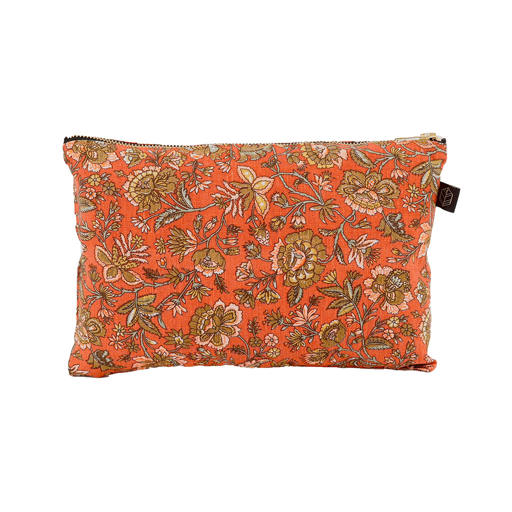 Découvrez notre sublime trousse fleurie en lin terre brulée, un accessoire indispensable pour organiser vos essentiels avec style.