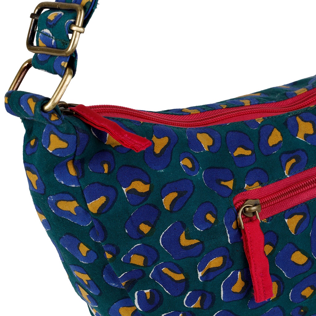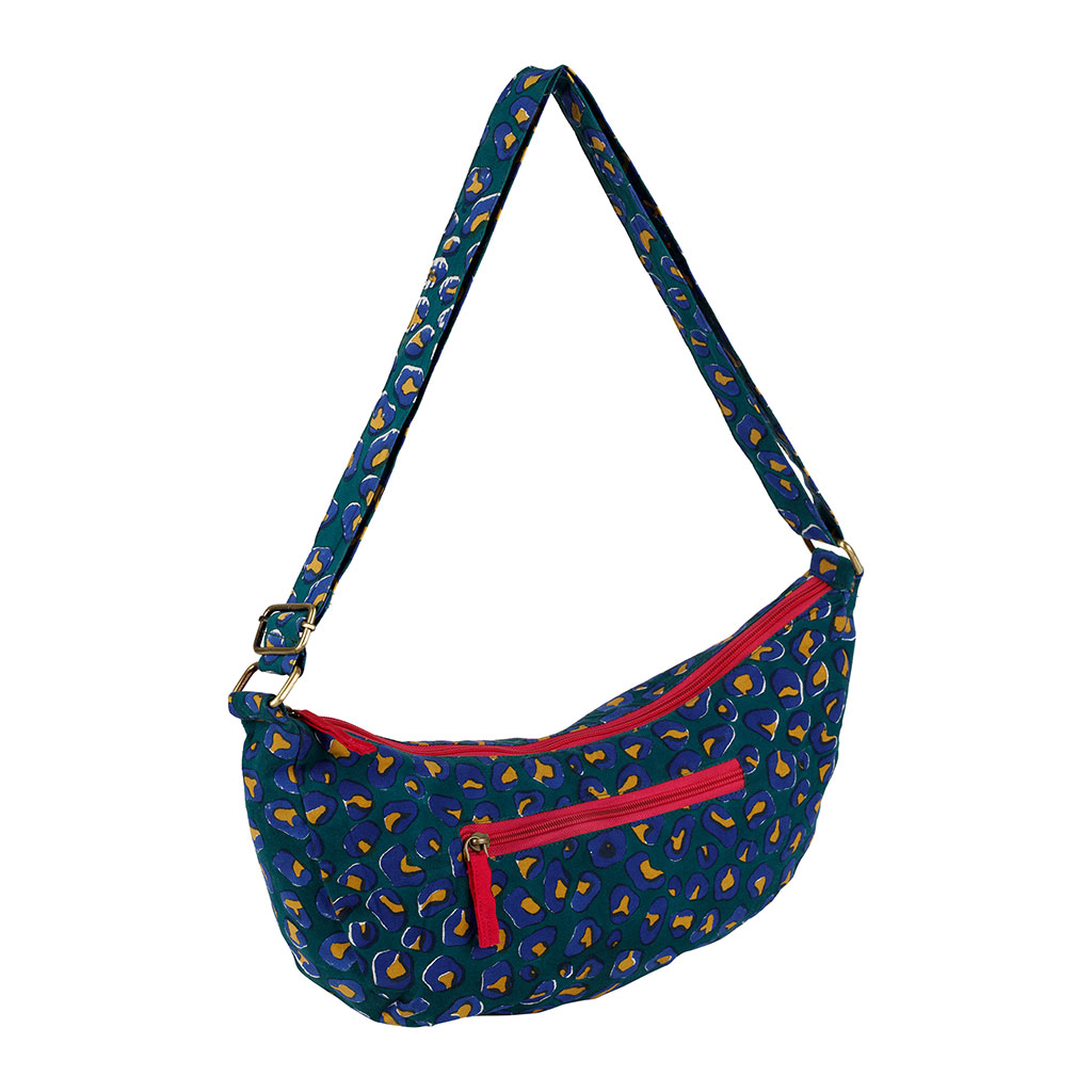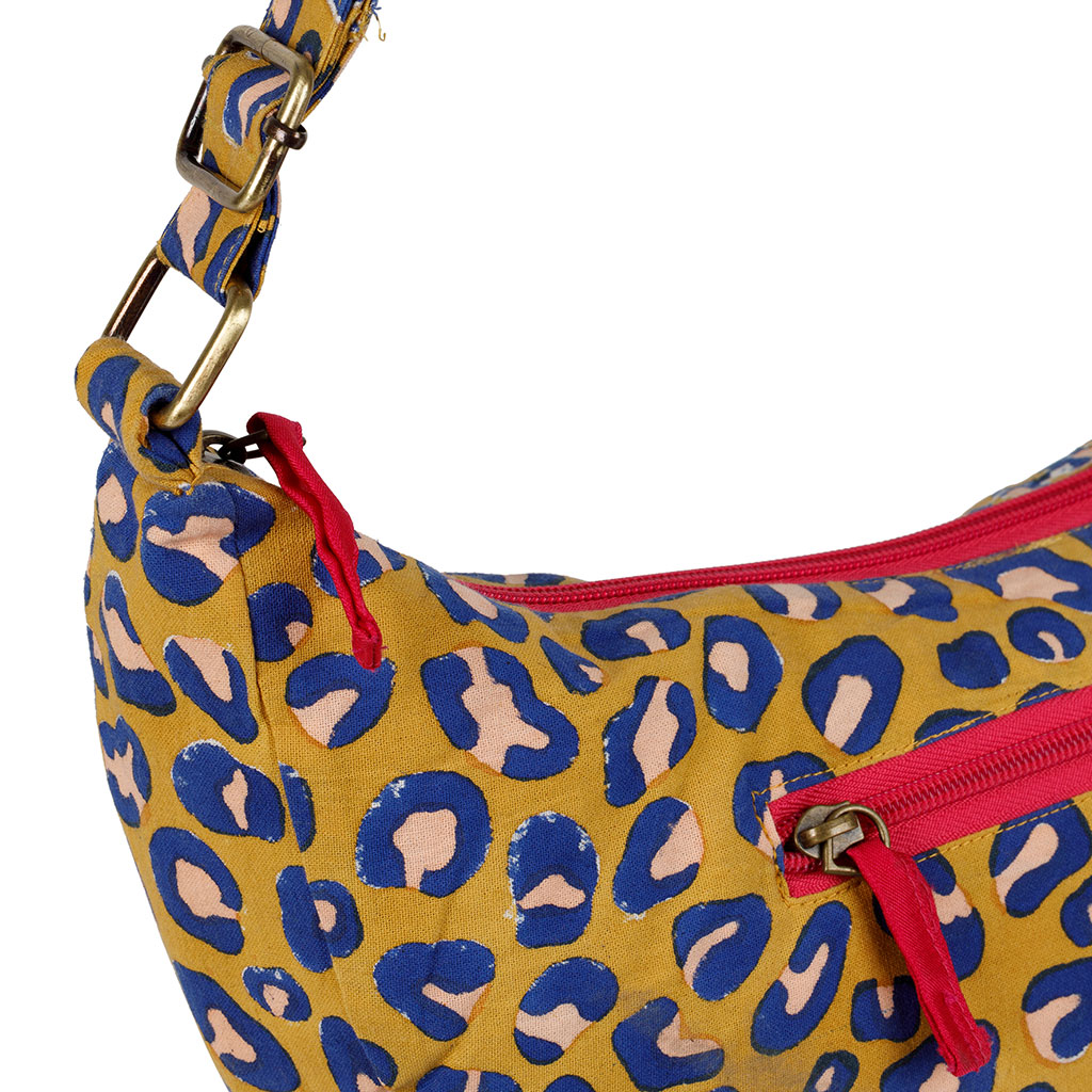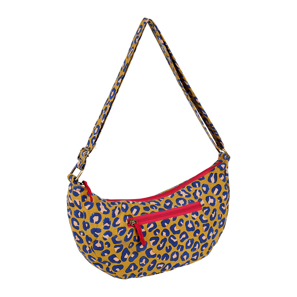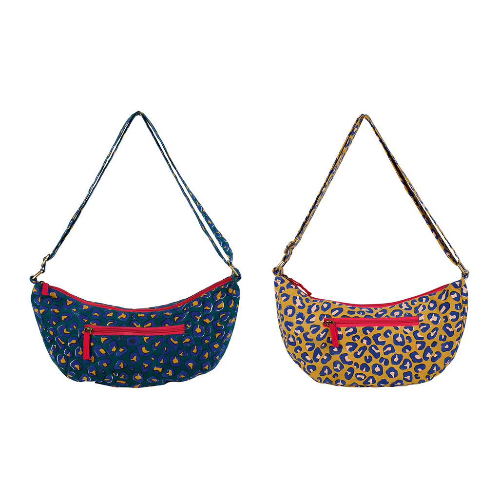 Découvrez notre ensemble irrésistible de sacs lunes en coton à motif léopard bleu et moutarde.