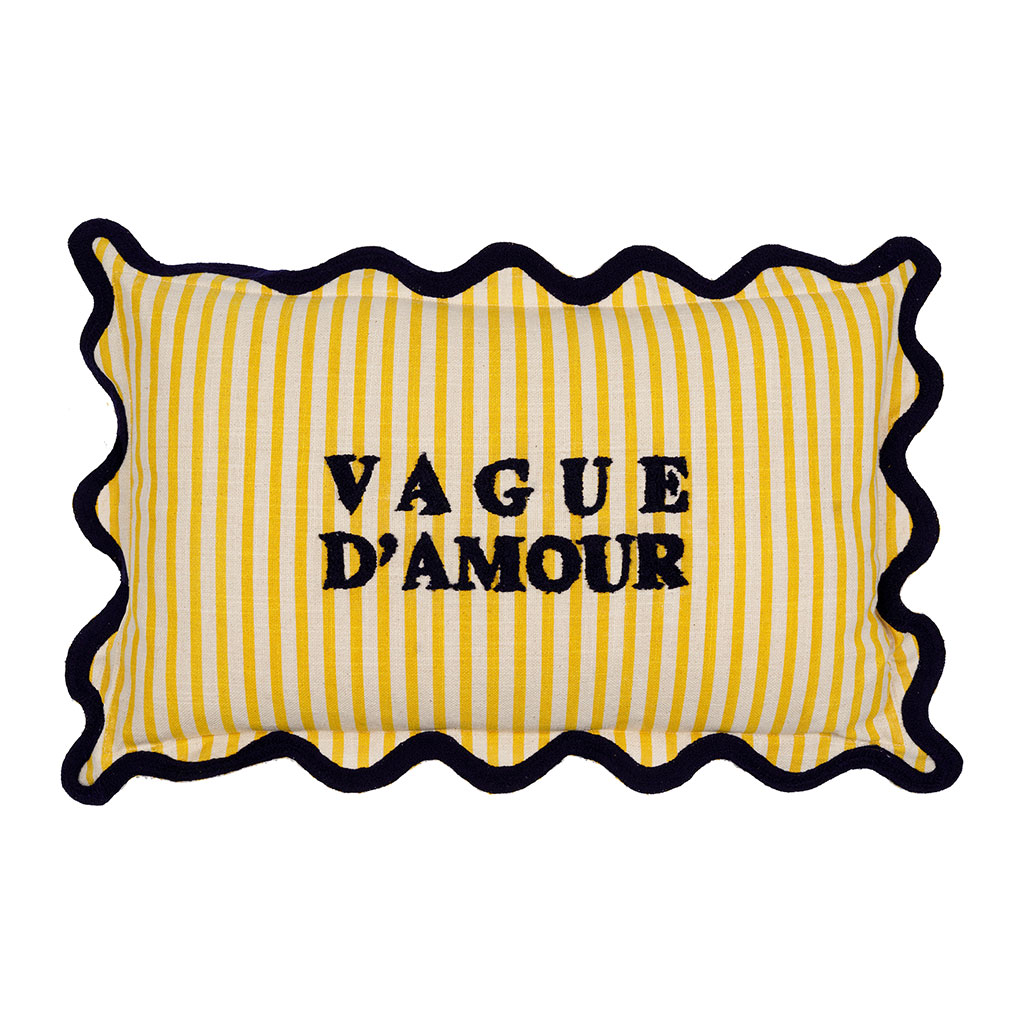 05 56 69 68 67-contact@fabriquedestyles.frCoussin en coton brodé "vague d'amour" rayé jaune et bleu marine 50x30cm - Plouf&Sun