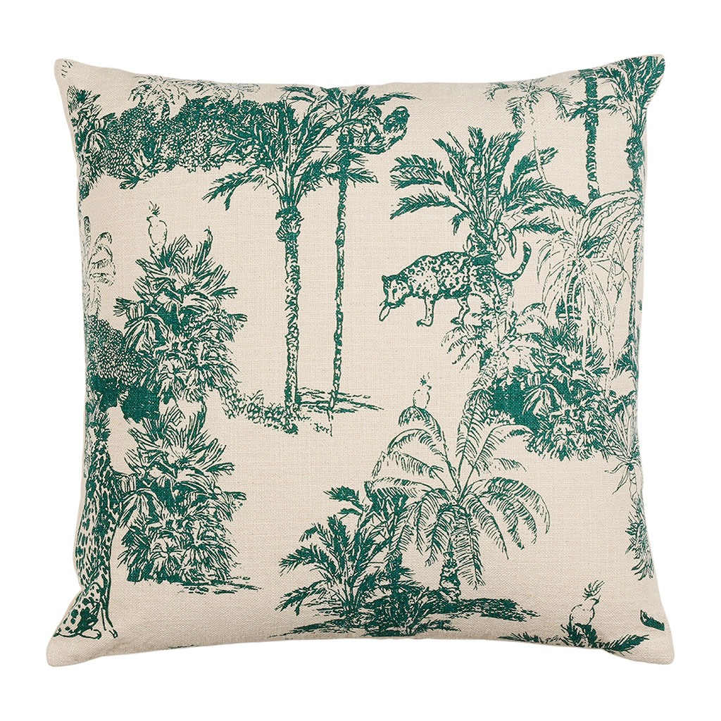 05 56 69 68 67-contact@fabriquedestyles.frHousse de coussin en coton écru et palmiers émeraude 45x45cm - Mocoa