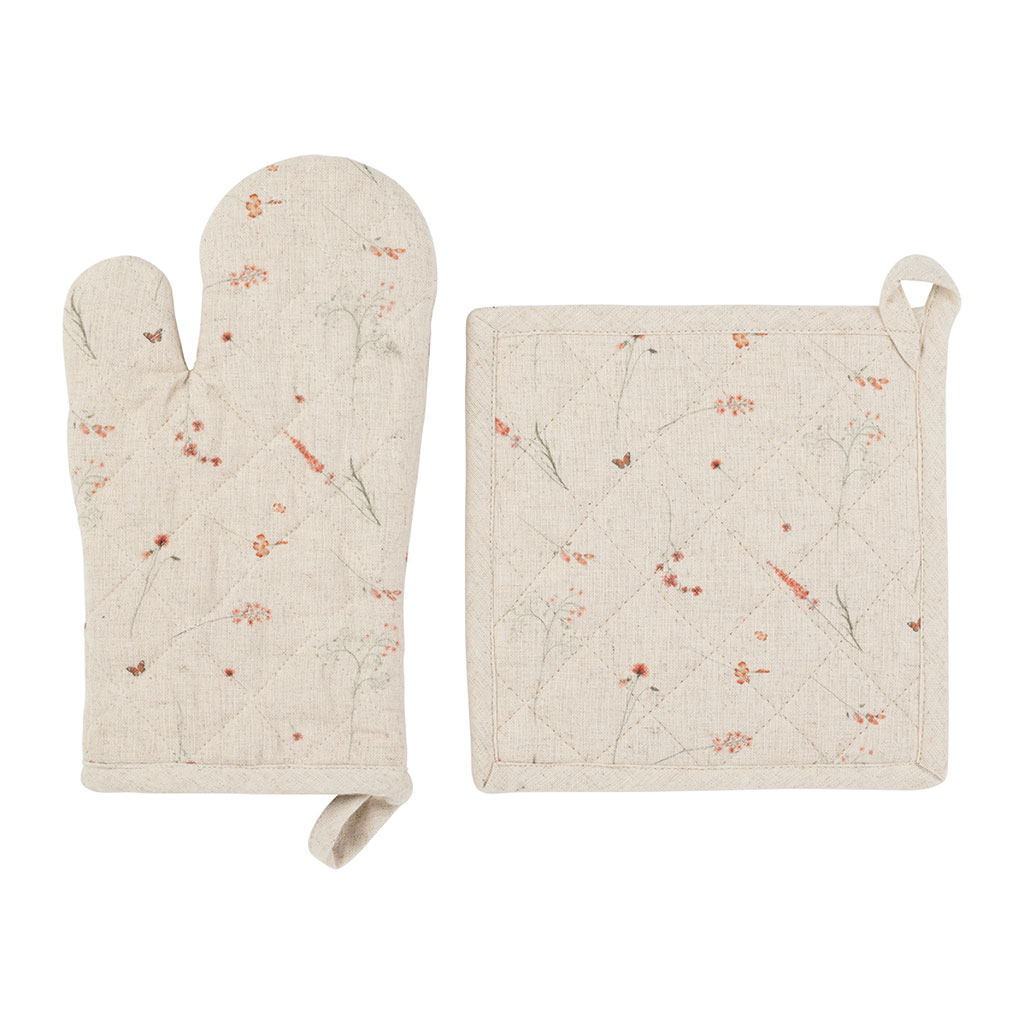 Ajoutez une touche de charme tout en protégeant vos mains lors de la cuisson avec ce gant et cette manique en coton beige.