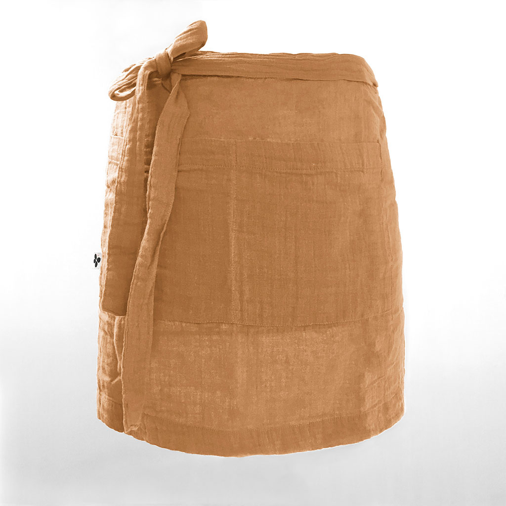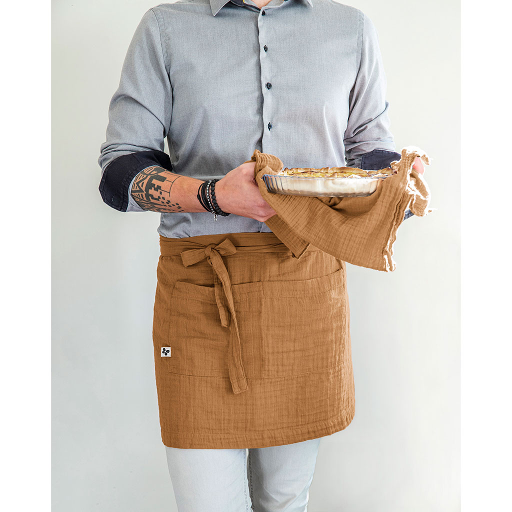 Découvrez le magnifique tablier camel en gaze de coton de dimensions 45x80cm de la marque Gaia.